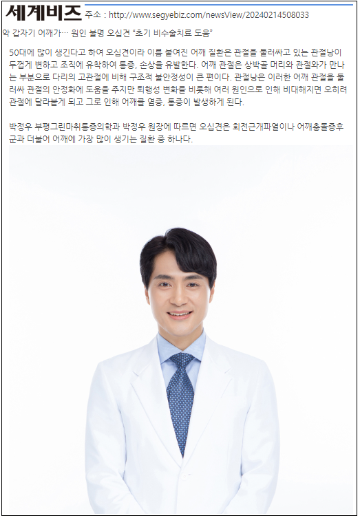 악.. 갑자기 어깨가.. 원인 불명 오십견 '초기 비수술치료 도움'
