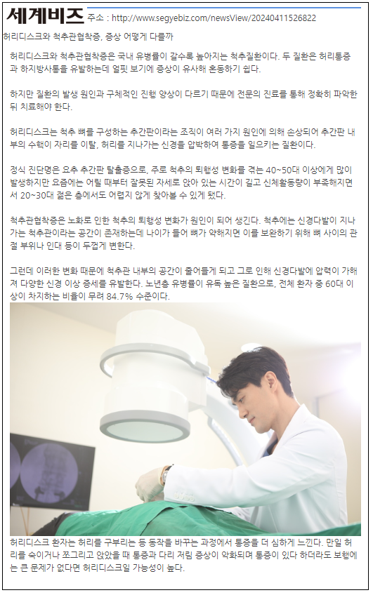 두 질환은 허리통증과 하지방사통을 유발하는데 얼핏 보기에 증상이 유사해 혼동하기 쉽습니다.