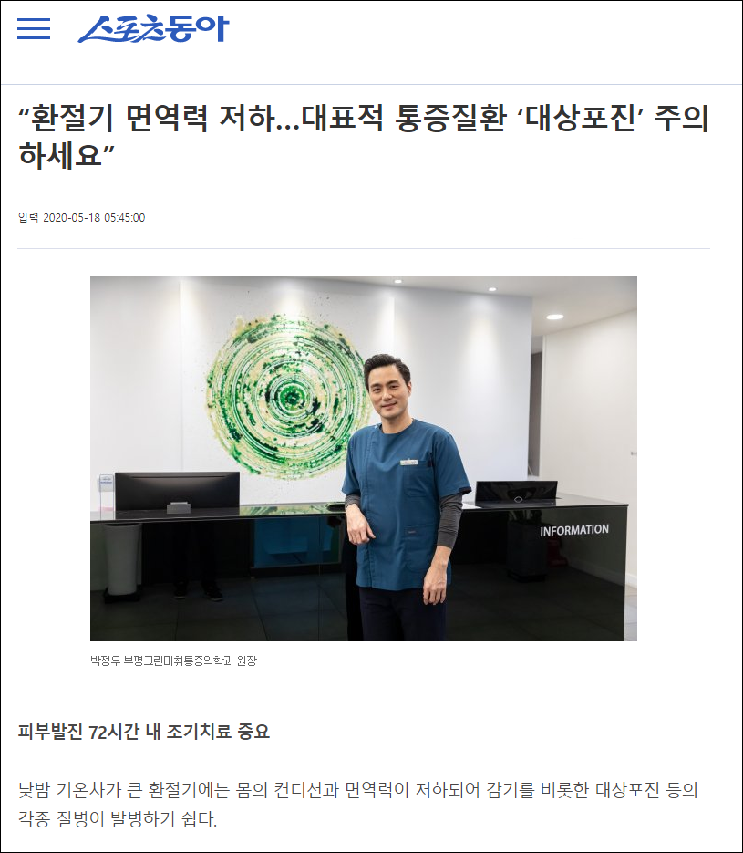 면역력 저하 대표적인 통증질환 대상포진에 대한 박정우 대표원장님의 의학칼럼을 소개합니다.