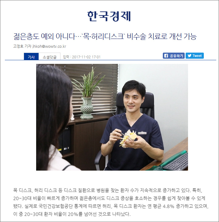 [한국경제] 젊은층도 예외 아니다…`목·허리디스크` 비수술 치료로 개선 가능