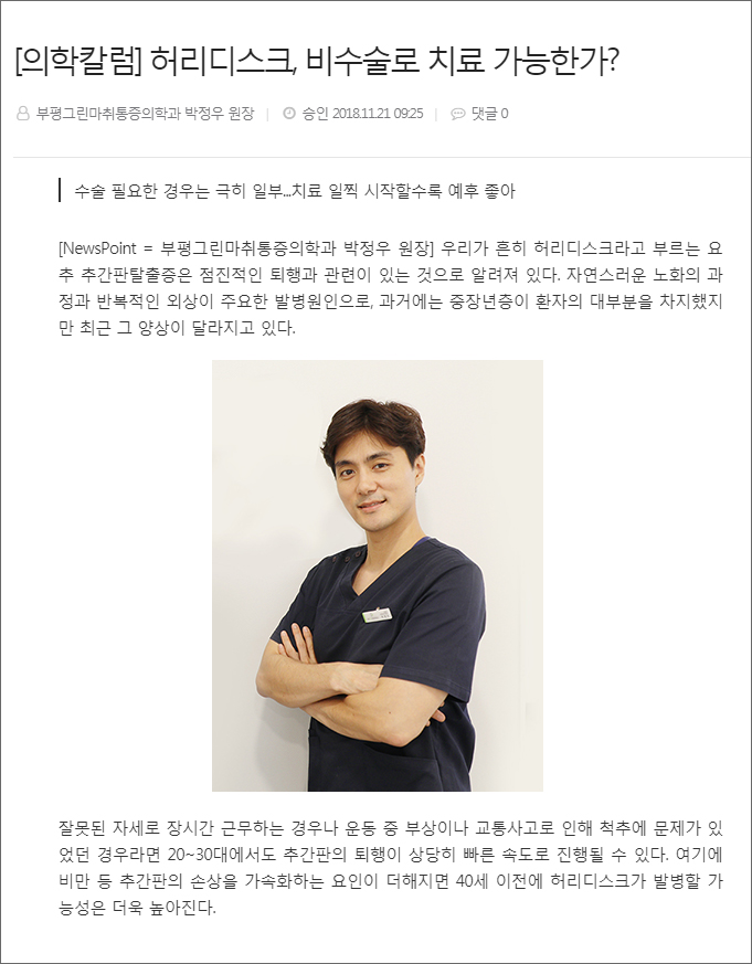 허리디스크 비수술 치료에 관한 박정우 원장님의 의학칼럼을 소개합니다.