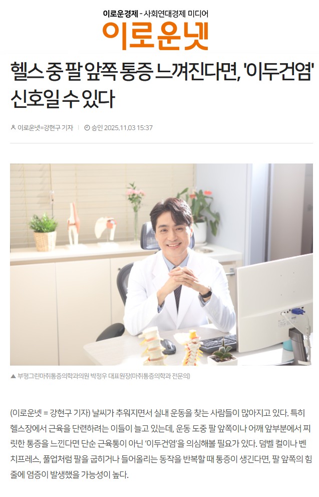 [언론보도] 헬스 중 팔 앞쪽 통증 느껴진다면, '이두건염' 신호일 수 있다 작성일 : 2025.11.03 부평그린마취통증의학과 댓글 : 0 조회 : 215 [기사 원문 보러가기] https://www.eroun.net/news/articleView.html?idxno=66173 자세한 내용은 링크를 클릭하시면 확인하실 수 있습니다.