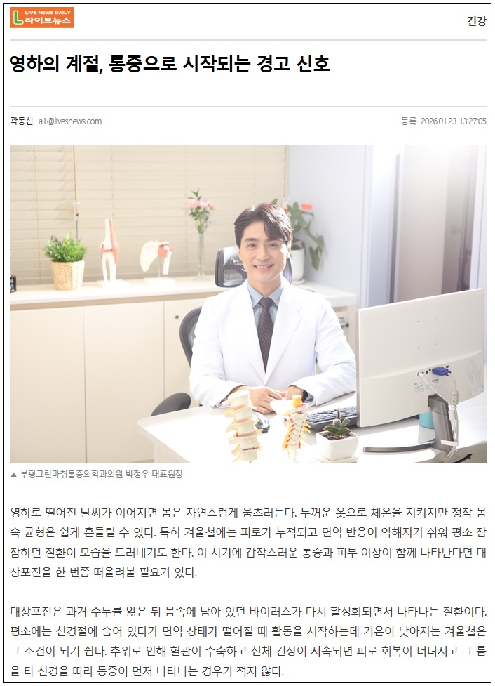 [언론보도] 영하의 계절, 통증으로 시작되는 경고 신호 작성일 : 2026.01.23 부평그린마취통증의학과 댓글 : 0 조회 : 638 [기사 원문 보러가기] https://www.livesnews.com/news/article.html?no=58924 자세한 내용은 링크를 클릭하시면 확인하실 수 있습니다.