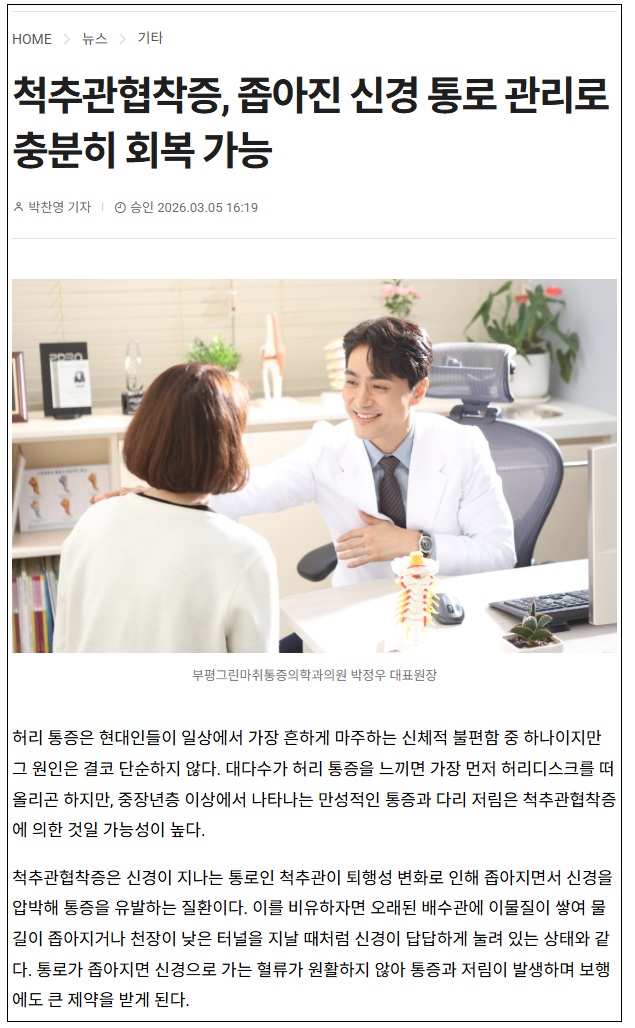 [언론보도] "다리가 저리고 걷기 힘들다면?" 척추관협착증 조기 진단의 중요성