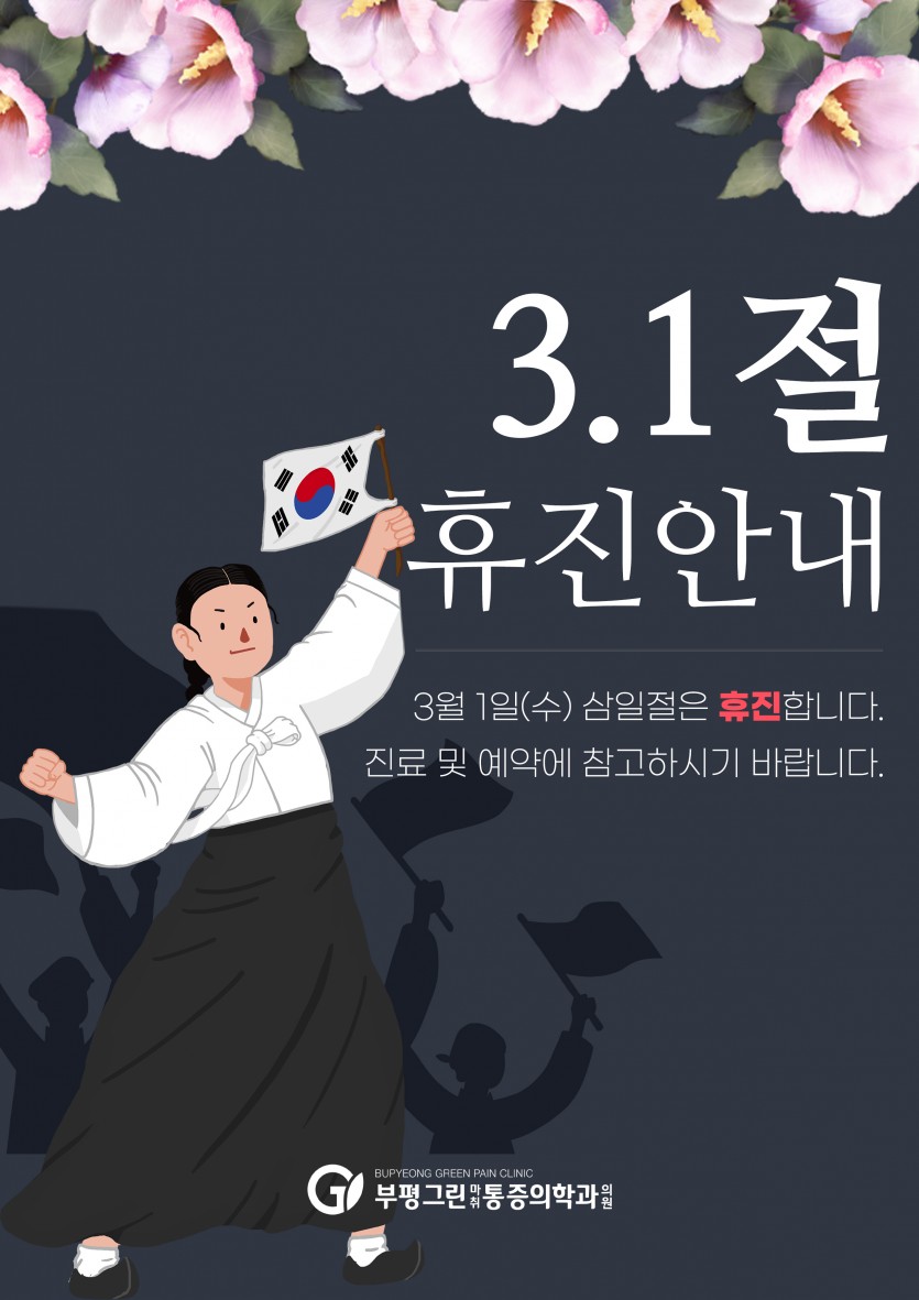 [공지사항] 3.1절 진료안내 작성일 : 2023.02.22 부평그린마취통증의학과 댓글 : 0 조회 : 1,684 3.1절 진료안내입니다. 내원 전 확인하시어 진료에 불편이 없으시길 바랍니다.