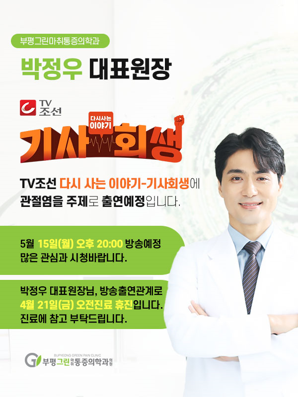 [공지사항] 기사회생 박정우 대표원장님 출연 5월 15일 오후 8:00 작성일 : 2023.05.08 부평그린마취통증의학과 댓글 : 0 조회 : 1,577 기사회생 박정우 대표원장님 출연 5월 15일 오후 8:00
