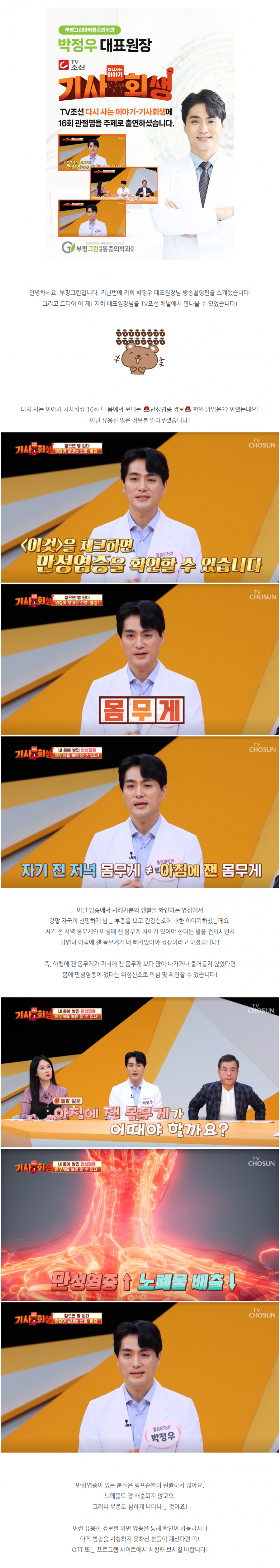 [공지사항] 다시 사는 이야기 기사회생 16회 박정우 대표원장님 출연 작성일 : 2023.05.16 부평그린마취통증의학과 댓글 : 0 조회 : 1,773 다시 사는 이야기 기사회생 16회 박정우 대표원장님 출연