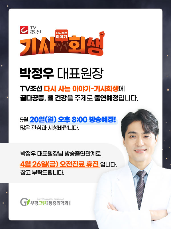 [공지사항] 5월 20일 박정우 대표원장님 TV조선 기사회생 출연 예정! 작성일 : 2024.04.18 부평그린마취통증의학과 댓글 : 0 조회 : 1,848 5월 20일 박정우 대표원장님 TV조선 기사회생 출연 예정! 그래서 4월 26일 금요일 오전진료는 휴진입니다. 내원에 불편이 없으시길 바라며, 많은 시청 바랍니다 ^^