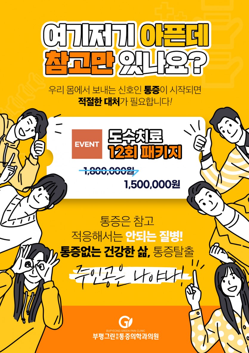 [공지사항] 여기저기 아픈데 참고만 있나요? 작성일 : 2022.09.23 부평그린마취통증의학과 댓글 : 0 조회 : 1,938 우리 몸에서 보내는 신호인 통증이 시작되면 적절한 대처가 필요합니다! 통증은 참고 적응해서는 안 되는 질병! 통증없는 건강한 삶, 통증탈출 주인공은 나야나!