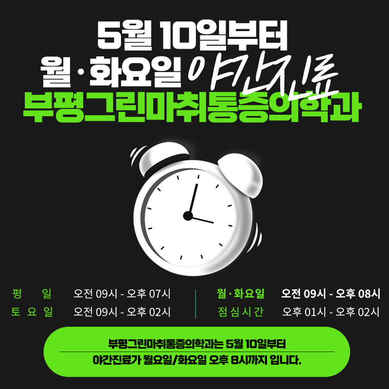 [공지사항] 5월 10일 부터 월·화 야간진료! 작성일 : 2021.05.12 부평그린마취통증의학과 댓글 : 0 조회 : 2,733 안녕하세요. 부평그린마취통증의학과입니다. 2021년 5월 10일부터 평일 야간 진료가 월요일, 화요일 오후 8시까지 입니다. 참고하셔서 내원하실 수 있습니다.