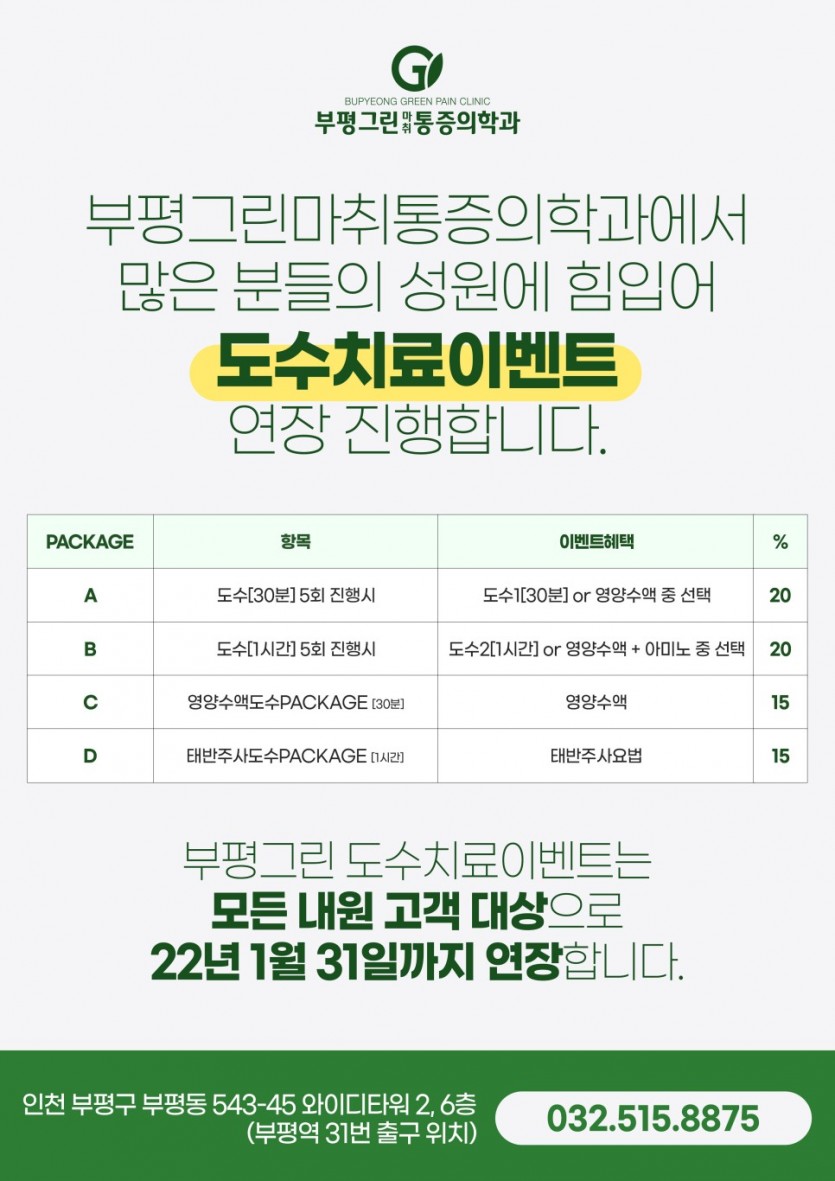 [공지사항] 많은 분들의 성원에 힘입어 도수치료이벤트를 연장진행합니다. 작성일 : 2022.08.29 부평그린마취통증의학과 댓글 : 0 조회 : 1,734 많은 분들의 성원에 힘입어 도수치료이벤트를 연장진행합니다.