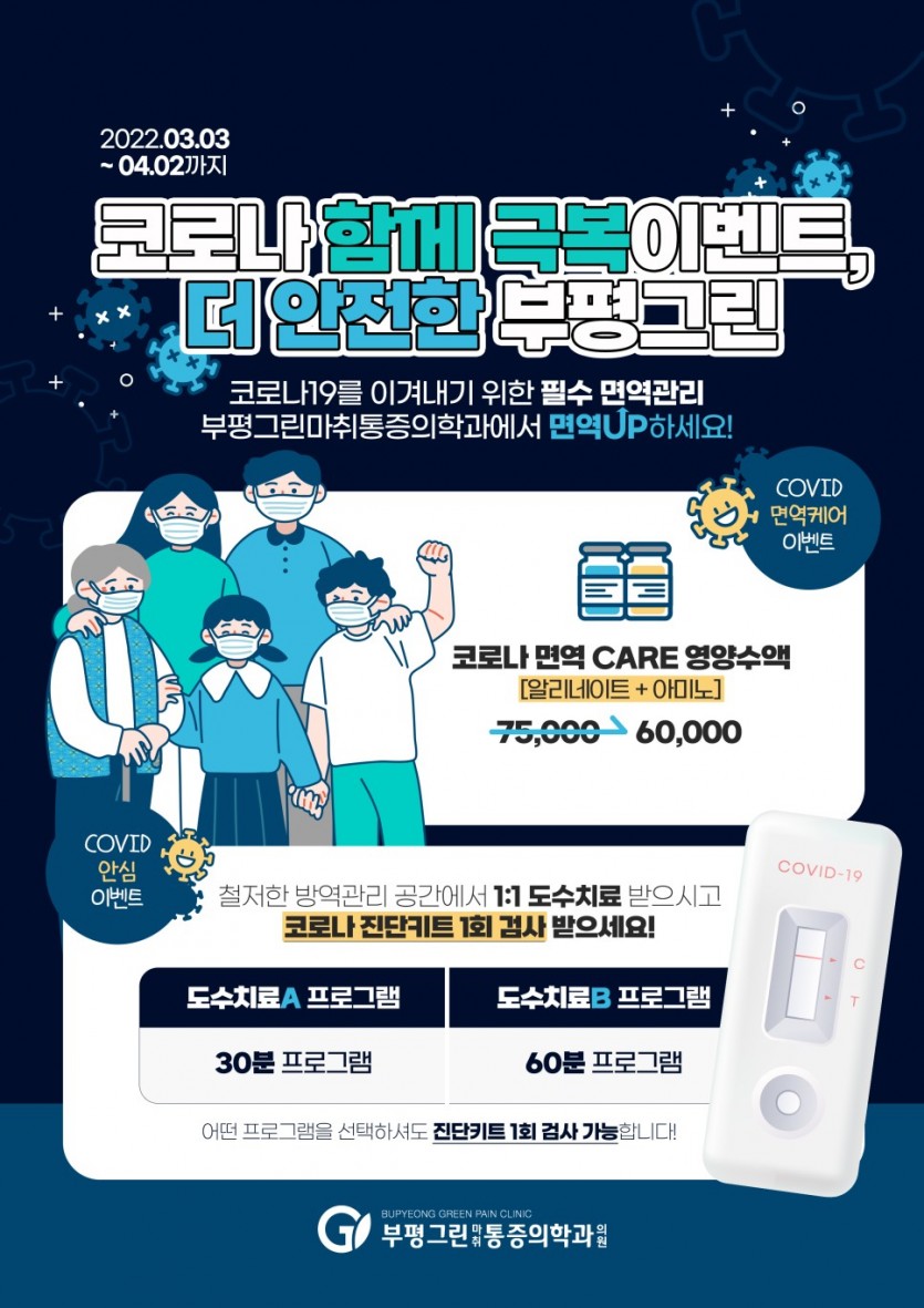 [공지사항] 코로나 극복 이벤트 부평그린이 함께 합니다! 작성일 : 2022.08.29 부평그린마취통증의학과 댓글 : 0 조회 : 1,679 코로나 극복 이벤트 부평그린이 함께 합니다!