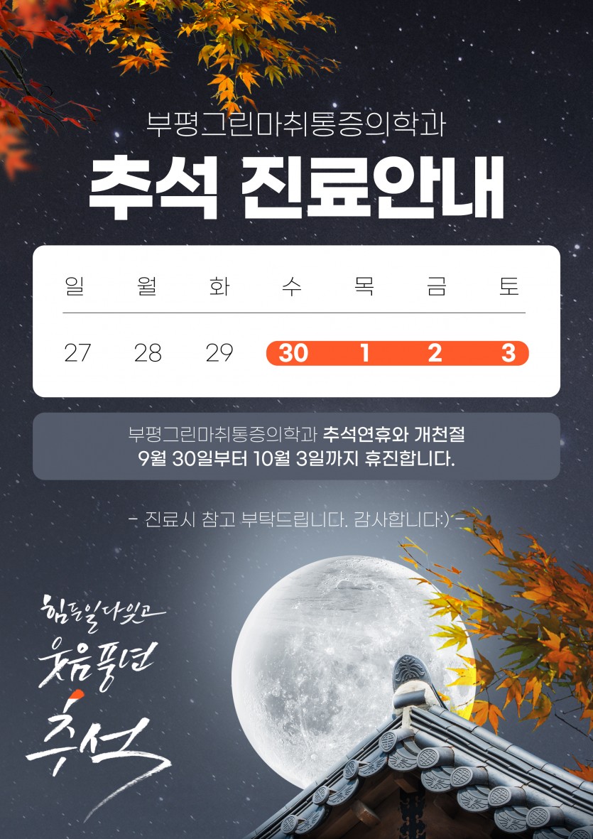 [공지사항] 2020년 추석/개천절 진료안내 작성일 : 2020.09.02 부평그린마취통증의학과 댓글 : 0 조회 : 2,414 2020년 추석연휴, 개천절 휴진하오니 진료시 참고부탁드립니다. 감사합니다:)