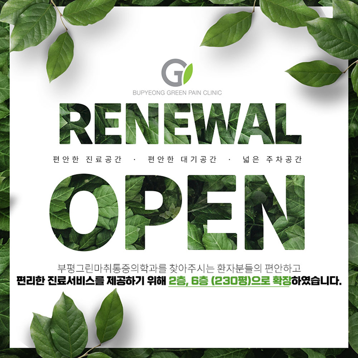 [공지사항] 21년 1월 25일 원내확장 오픈일 작성일 : 2021.01.18 부평그린마취통증의학과 댓글 : 0 조회 : 2,832 부평그린마취통증의학과를 찾아주시는 환자분들의 편안하고 편리한 진료서비스를 제공하기 위해 2층, 6층 (230평)으로 확장하였습니다! 1월 25일 새로워진 부평그린을 만나보실 수 있습니다!