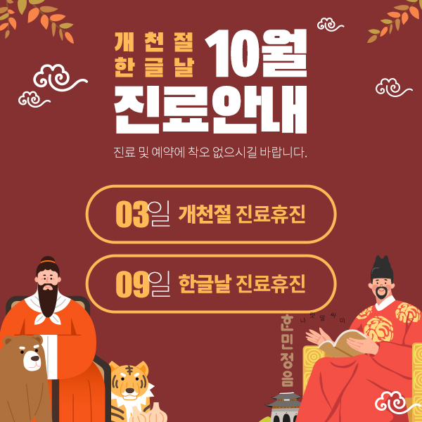 [공지사항] 10월 3일, 9일 휴진안내 작성일 : 2019.10.02 부평그린마취통증의학과 댓글 : 0 조회 : 2,764 2019년 10월 3일, 9일 휴진안내입니다. 진료와 예약에 착오없으시길 바랍니다. 감사합니다:)