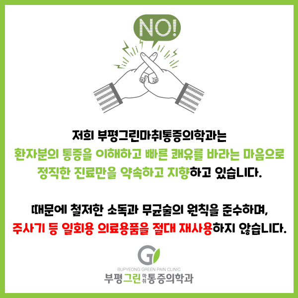 [공지사항] 주사기 등 일회용 의료용품을 절대 재사용하지 않습니다. 작성일 : 2019.11.15 부평그린마취통증의학과 댓글 : 0 조회 : 2,988 저희 부평그린마취통증의학과는 환자분의 통증을 이해하고 빠른 쾌유를 바라는 마음으로 정직한 진료만을 약속하고 지향하고 있습니다. 때문에 철저한 소독과 뮤균술의 원칙을 준수하며, 주사기 등 일회성 의료용품을 절대 재사용하지 않습니다.
