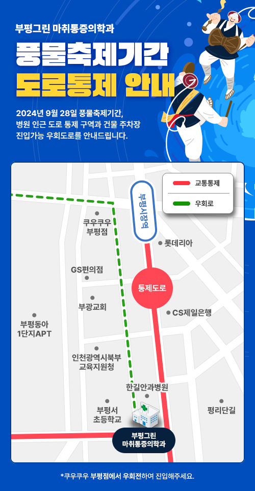 [공지사항] 주차장 진입가능 우회도로를 안내 작성일 : 2024.09.27 부평그린마취통증의학과 댓글 : 0 조회 : 1,824 안녕하세요, 부평그린통증의학과입니다. 9월 28-29일(토,일) 부평풍물대축제로 인해 병원 건물 주변 도로 통제가 있을 예정입니다. 28일 토요일 차량으로 내원해주시는 분들께서는 주차장 진입 시 우회 경로가 필요하니, 위 경로를 참고해 주시기 바랍니다. 안전하게 방문하셔서 통증 없이 축제도 즐기시길 바랍니다. 감사합니다.