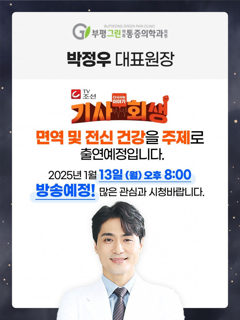 기사회생 1월 13일 박정우원장님 면역 및 전신 건강을 주제로 출연 예정입니다.