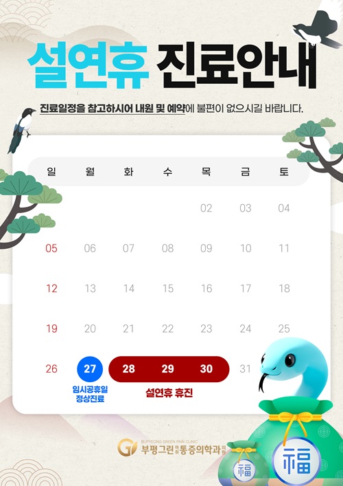 [공지사항] 2025년 설연휴 공지드립니다. 작성일 : 2025.01.27 부평그린마취통증의학과 댓글 : 0 조회 : 896 안녕하세요. 2025년 새해 복 많이 받으세요 ^^ 진료일정 확인하시어 내원에 불편이 없으시길 바랍니다.